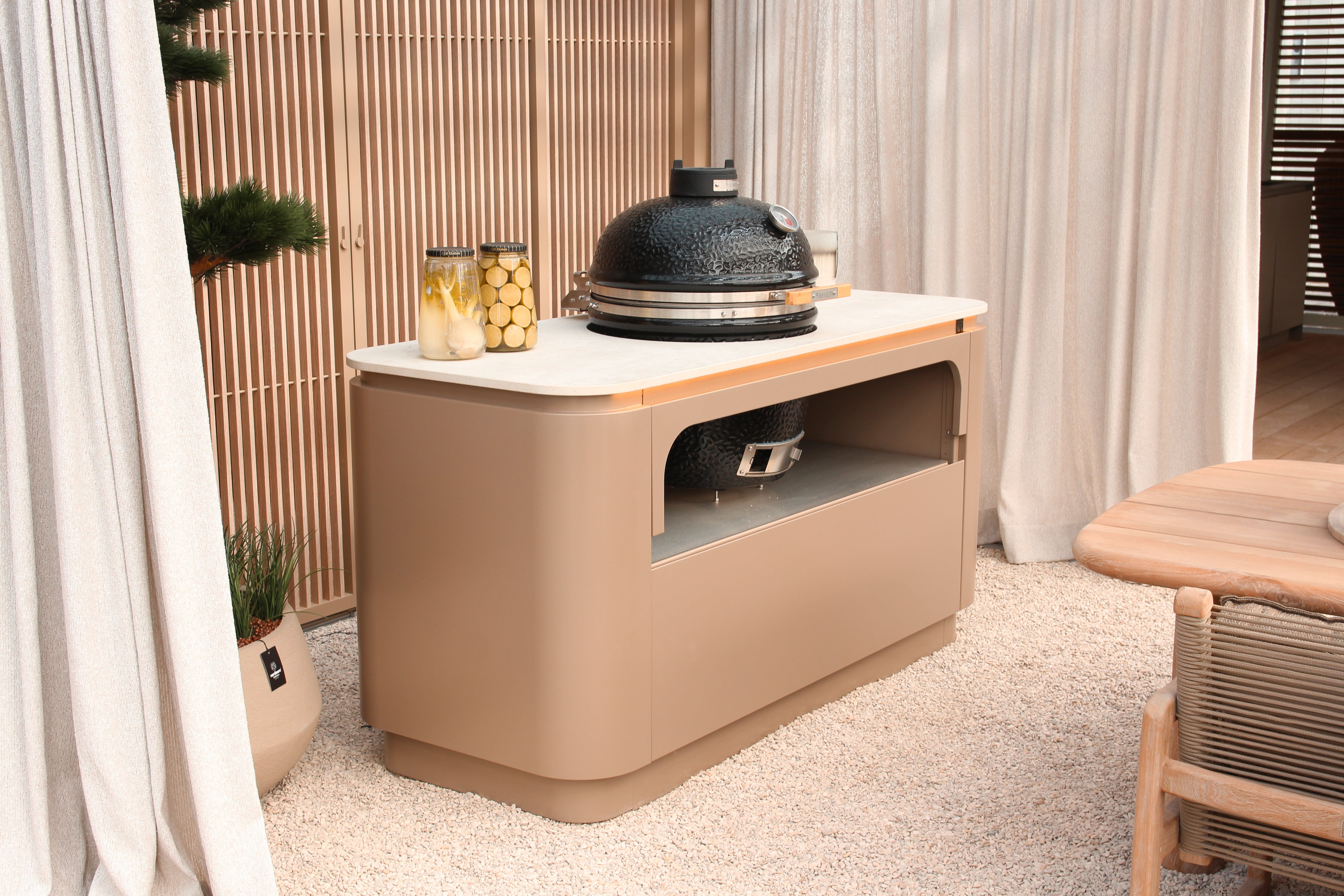 Creëer een buitenruimte waarin jouw buitenkeuken naadloos opgaat in de lijnen van de natuur.